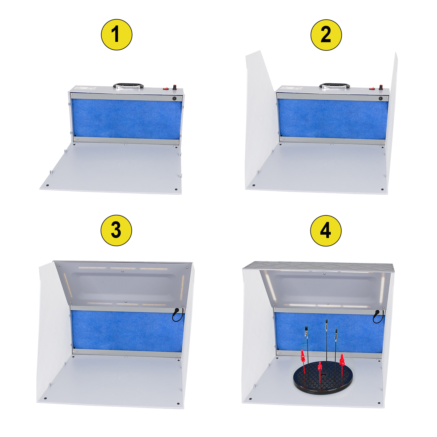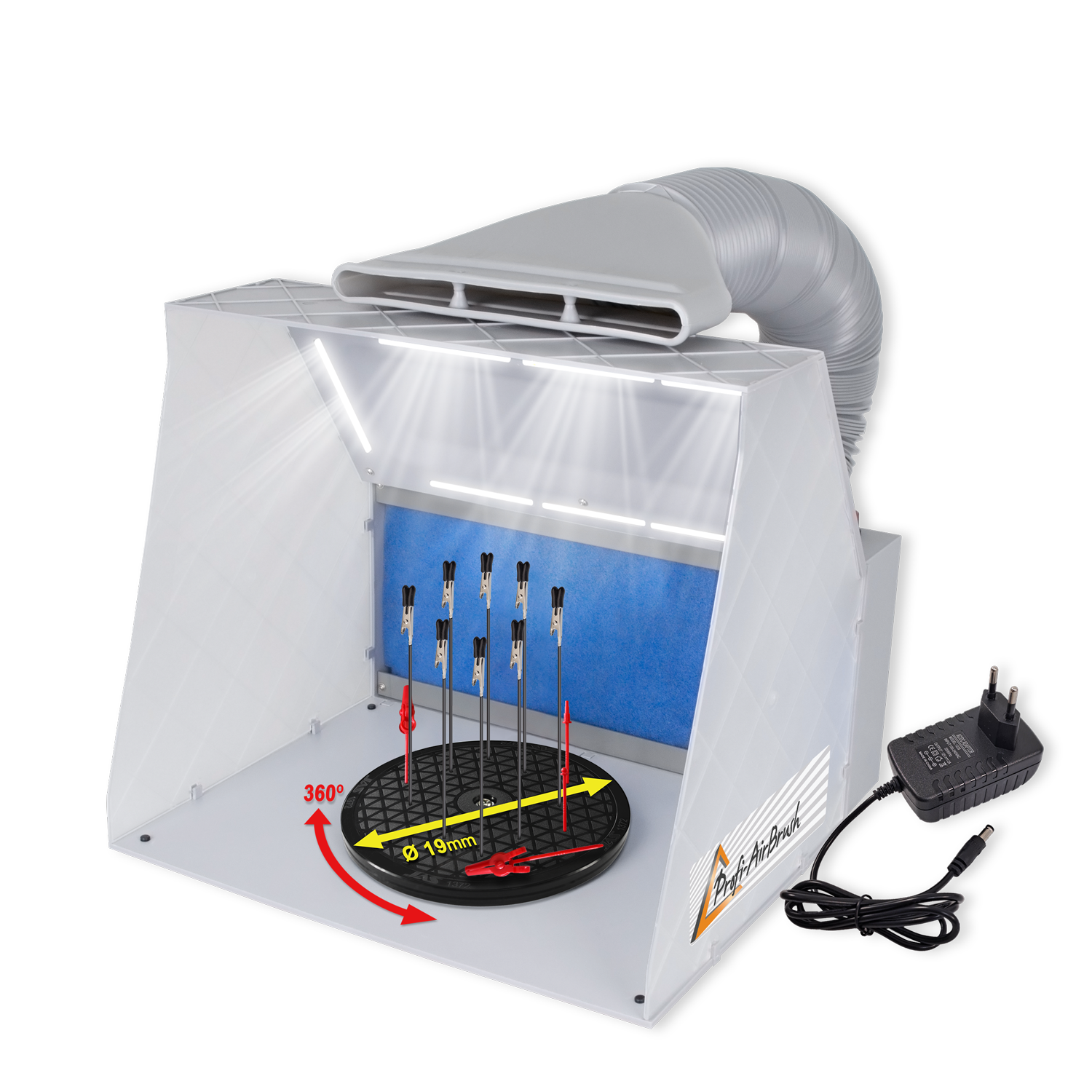Die Kompakte Lösung zur Tischaufstellung für alle Arten von Spray-Arbeiten. Besonders gut geeignet für Airbrush und Farbauftrag aus Sprühdosen. Preiswerte und gute Lösung für Ihr Hobby. Optimal zum Bemalen von kleinen Teilen: Modellautos, Zinnsoldaten, Keramiken usw. Leicht transportabel.