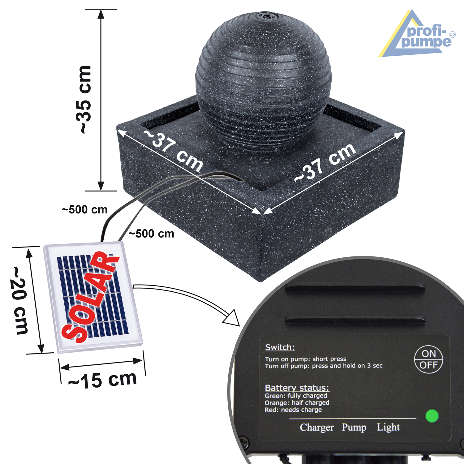 Dieser Solarbrunnen hat einen eingebauten Akku im Solarpanel. Sobald die Sonnenstrahlen das Solarpanel treffen wird der Akku geladen. Bei schlechten Lichtverhältnissen oder nach dem Sonnenuntergang kann der Solarbrunnen durch den vollgeladenen Akku weiter betrieben werden. Dies ist wichtig da das LED-Licht erst in der Nacht seine richtige Wirkung entfalten kann. Am nächsten Tag schaltet die Pumpe automatisch in den Solarmodus, wenn genug Sonnenlicht vorhanden ist. Die Akku-Funktion kann aber auch ausgeschaltet werden.