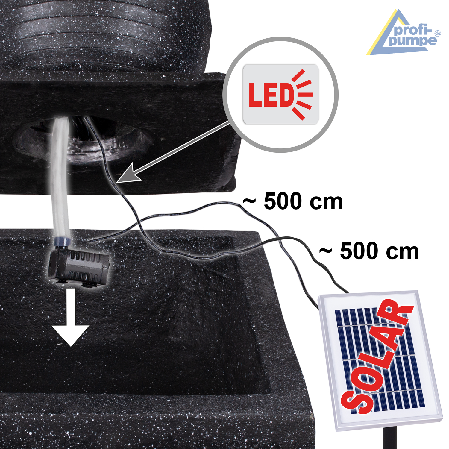 Bitte bedenken Sie, dass das Solarpanel stets im vollen Sonnenlicht zu platzieren und auszurichten ist, da sonst keine Pumpenfunktion garantiert werden kann.