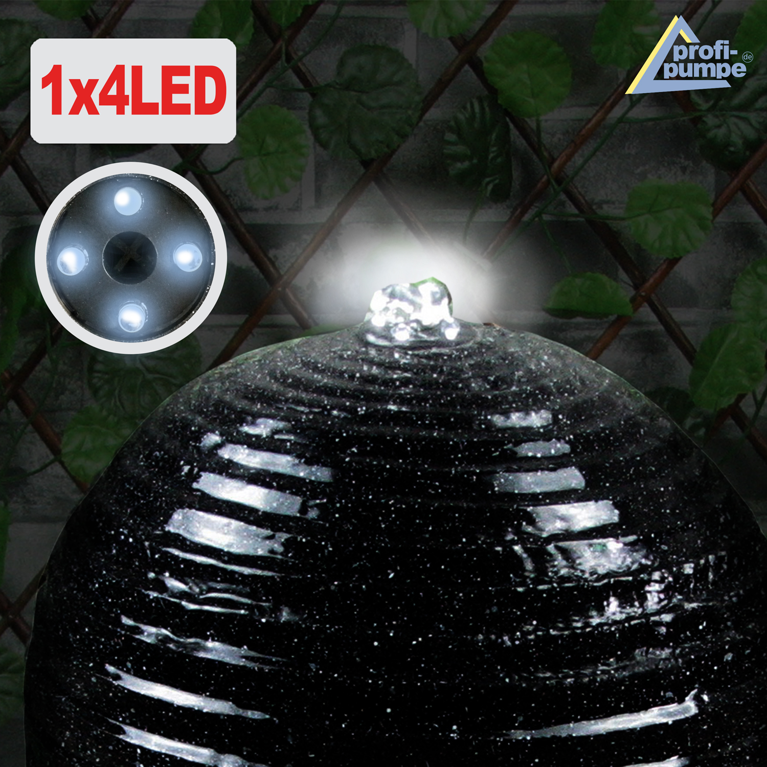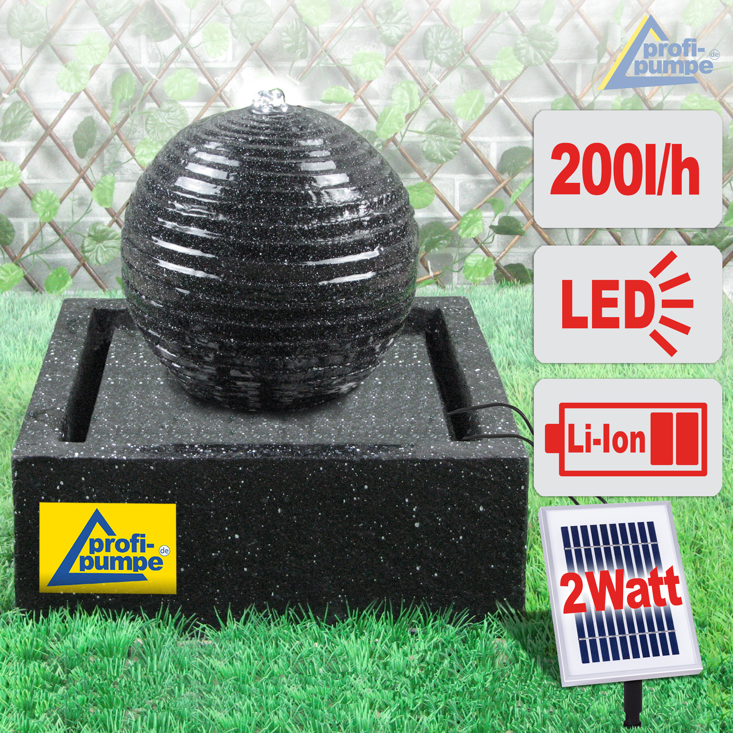 Solarbetriebener Garten-Brunnen mit Li-Ion Akku und LED-Licht