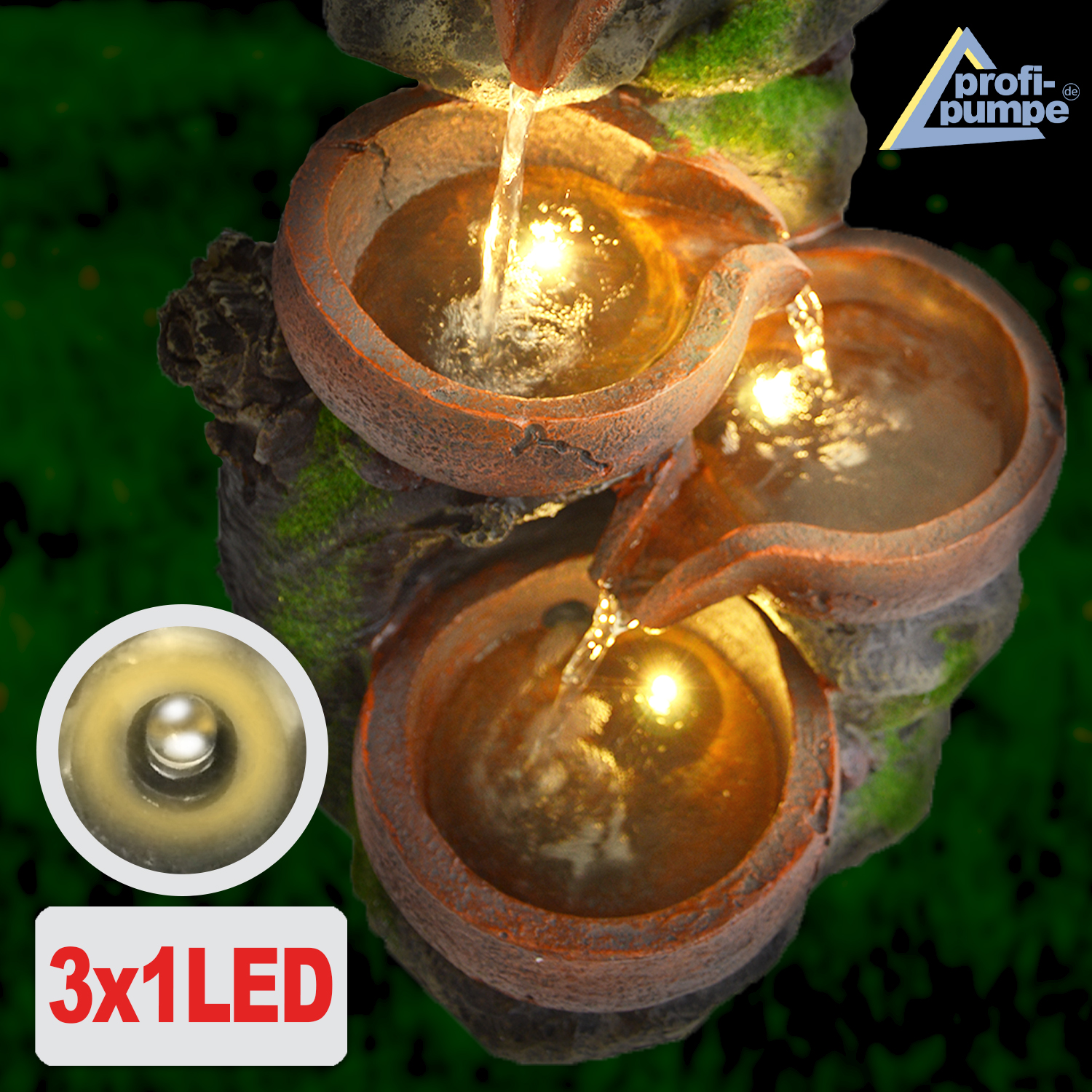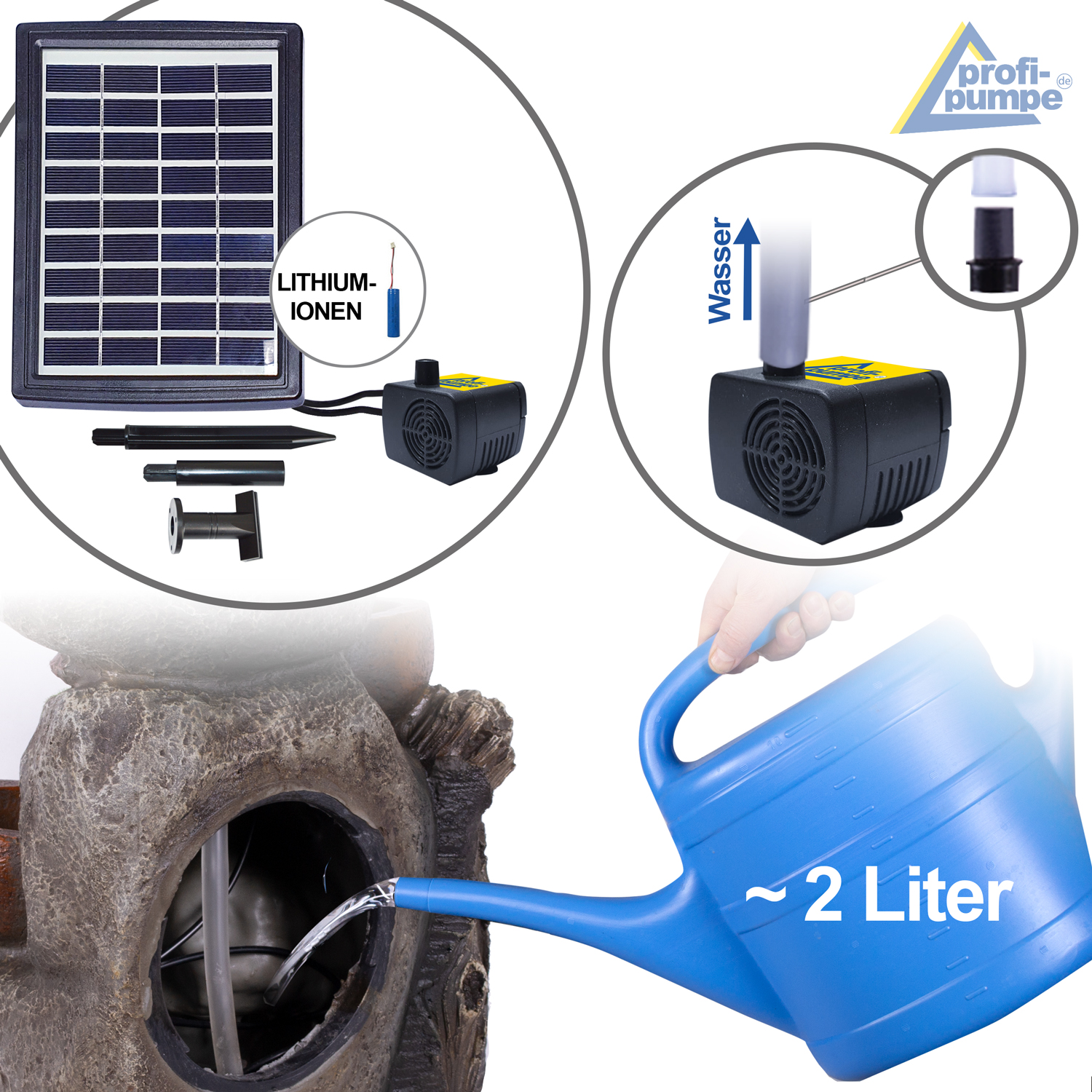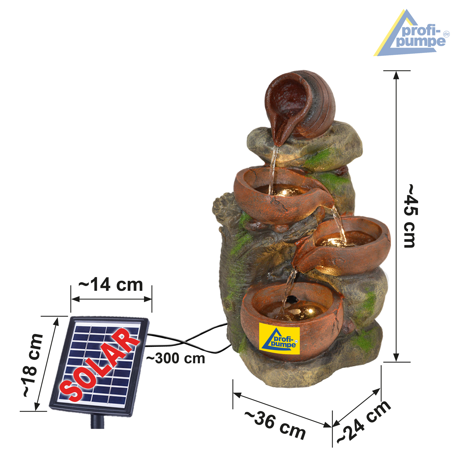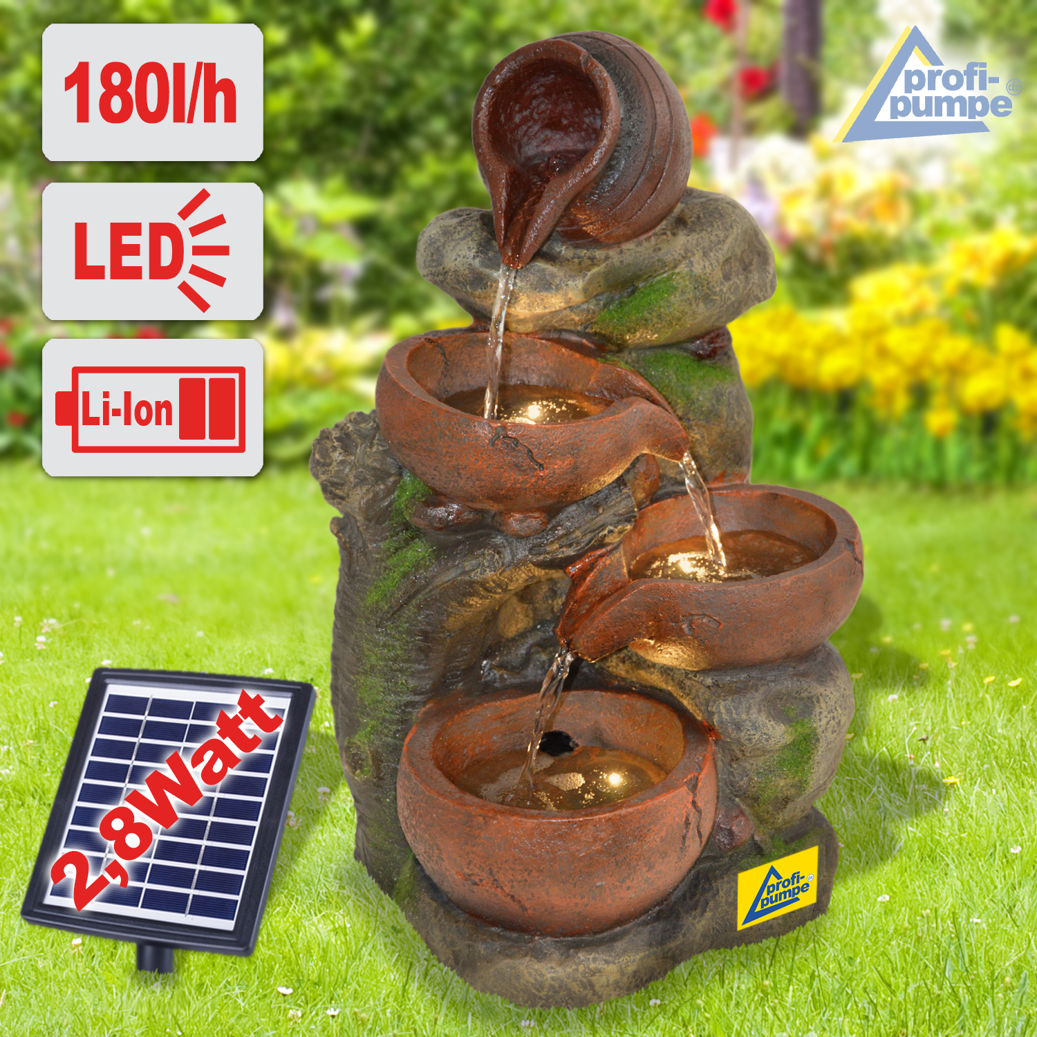 Solarbetriebener Garten-Brunnen mit Li-Ion Akku und LED-Lichtern