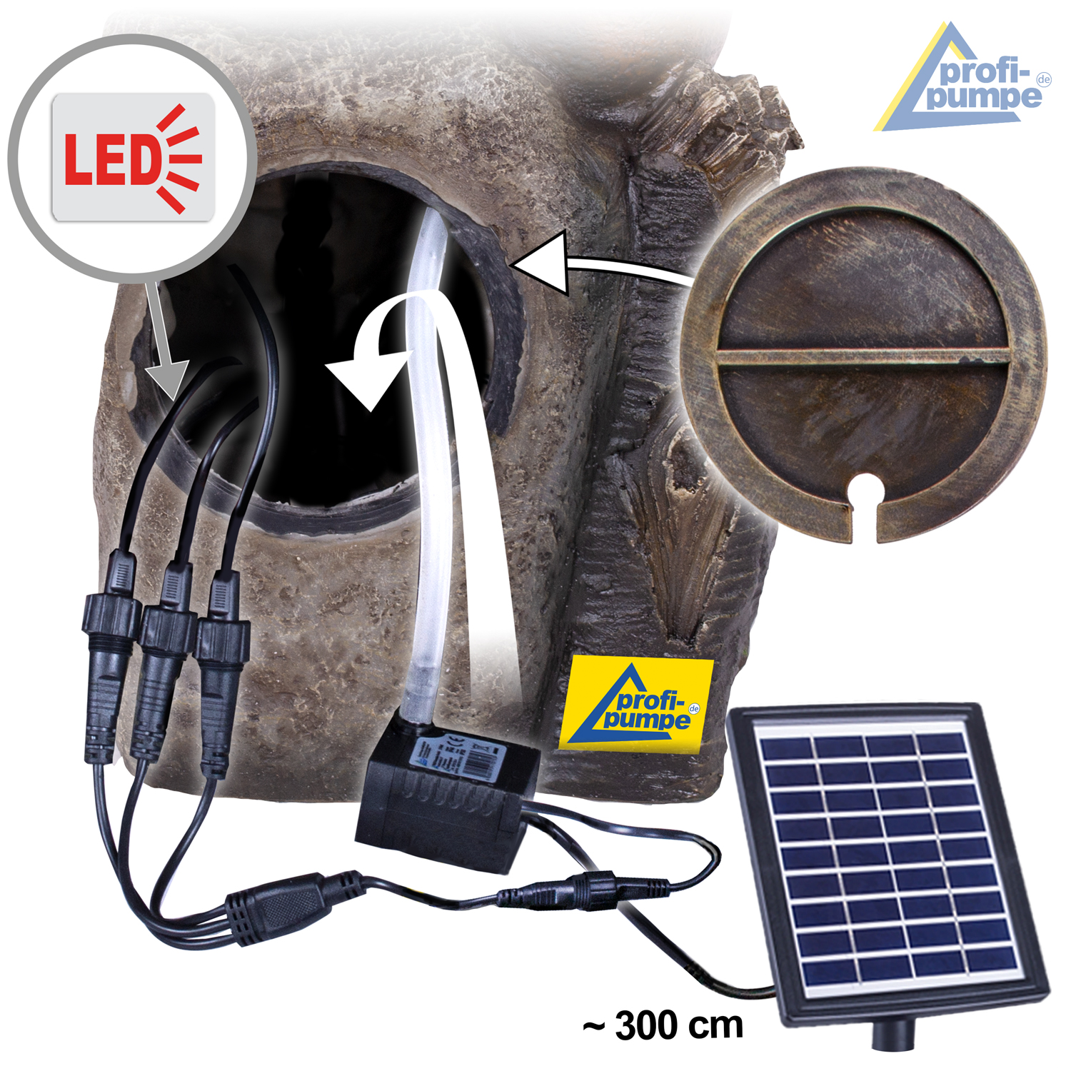 Diesen Gartenbrunnen können Sie an jeder Stelle in Ihrem Garten platzieren. Sie sind an keine Steckdose gebunden und das lästige Verlegen des 230V-Kabels entfällt. Außerdem können Sie das Solarsystem nach Ihrem Geschmack effektvoll Positionieren. Eine sichere Nutzung ist durch den Anschluss an das Solarpanel gegeben (gegenüber der 230V Steckdose). Sparen Sie sich den Ärger mit den durch Nagetiere beschädigten Kabeln und dadurch verursachten Stromausfällen. Bitte bedenken Sie, dass das Solarpanel stets im vollen Sonnenlicht zu platzieren und auszurichten ist, da sonst keine Pumpenfunktion garantiert werden kann.