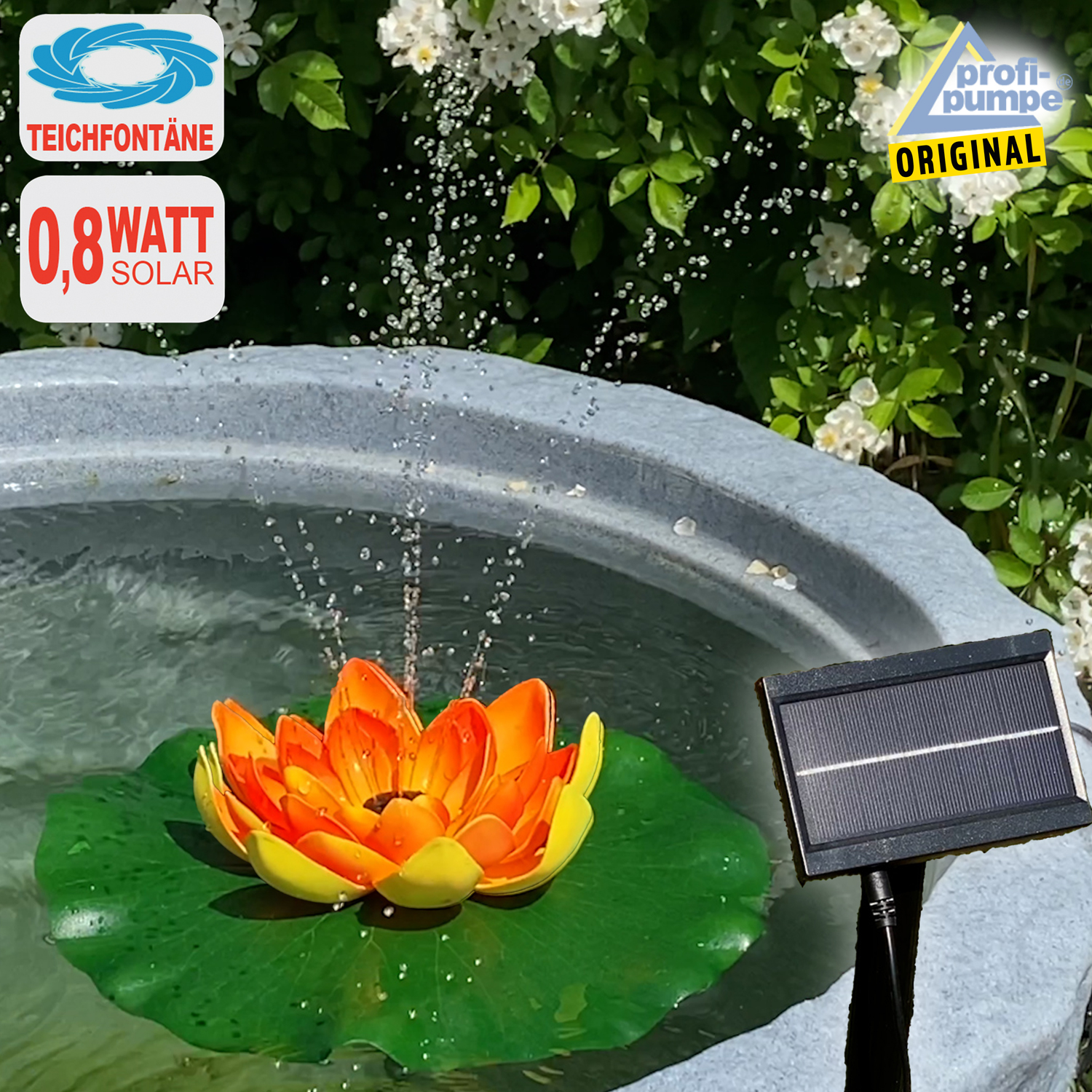 Das steckfertige Solar-Teichpumpen-Set ist sofort einsetzbereit und – sobald das leicht optimal auszurichtende Solar-Panel direkte Sonneneinstrahlung erhält – sofort betriebsbereit. Es besteht aus einem Lotus-Blatt mit Blüte (in weiß oder orange erhältlich), zwei verschiedenen Düsen (12-Loch-Düse, 7-Loch-Düse), einem Fontänen-Adapter, einem Pumpenauslass-Adapter, einem Durchflussregler und einem Solarpanel nebst Zubehör.