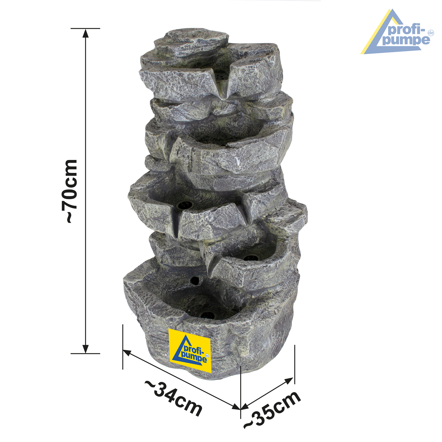 Der Garten- und Zimmerbrunnen “MÄRCHEN-FELS” mit der LED-Beleuchtung ist für den Innen- und Außenbereich geeignet. Der romantische Kaskadenbrunnen sorgt für eine tolle Atmosphäre und Entspannung, wertet jede Umgebung und belebt Wohnzimmer, Esszimmer, Flure und Eingangsbereiche, Wintergärten oder Balkone, Terrassen und Gärten im privaten wie gewerblichen Umfeld. Fließendes Wasser wirkt sich positiv auf die Stimmung aus und liefert ein angenehmes Mikroklima an heißen Sommertagen. Die wunderschöne Stein-Optik und die weiße LED-Beleuchtung machen den Brunnen Tag und Nacht zum perfekten Blickfang.
