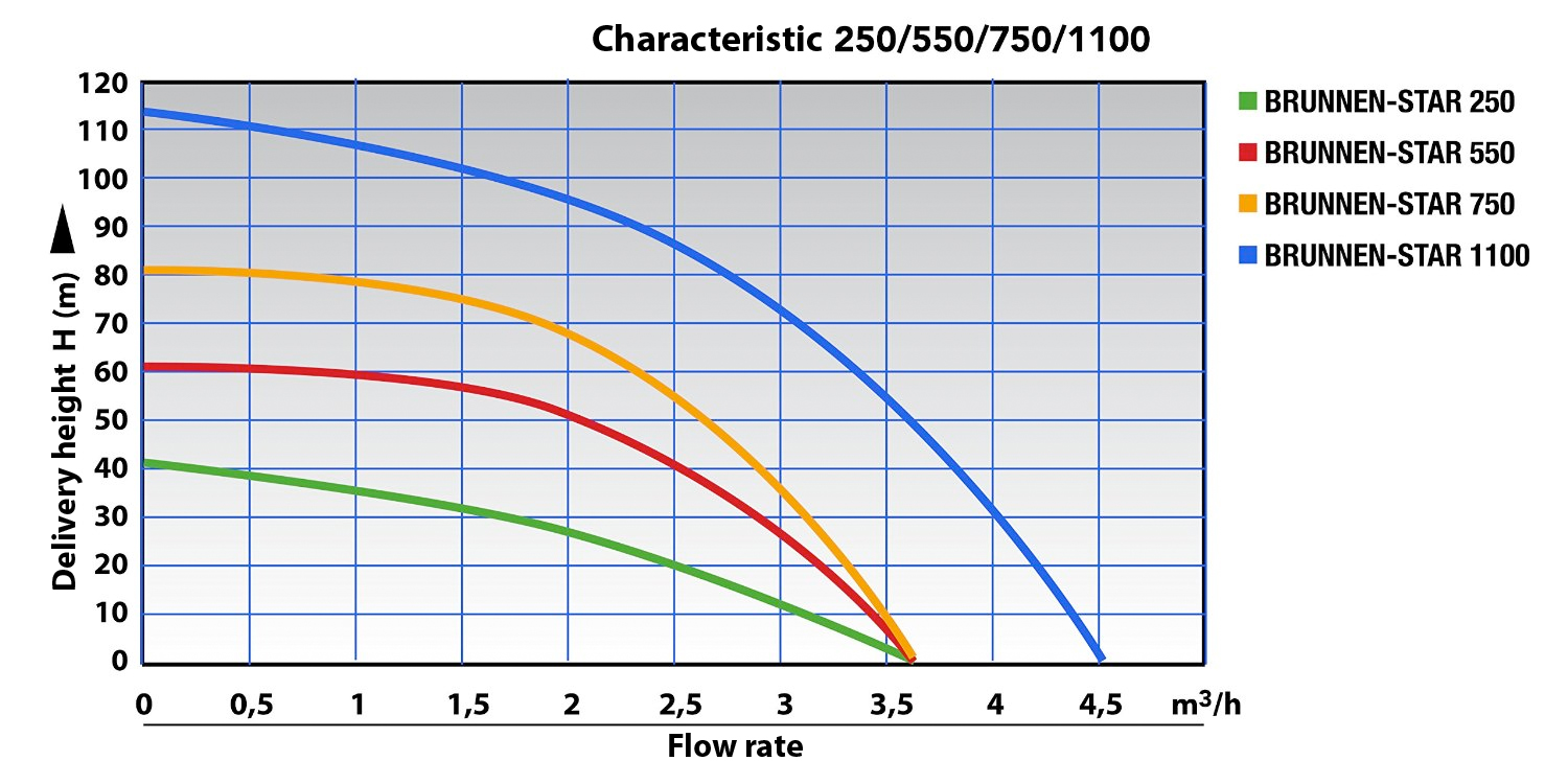 Die 3″-Tiefbrunnenpumpe BRUNNEN-STAR 1100-4 erbringt eine maximale Fördermenge von 4.500L/h. Die maximale Förderhöhe beträgt 114m und der maximale Förderdruck liegt bei 11,4 bar. Bitte beachten Sie, dass die Förderleistung bei steigender Förderhöhe entsprechend abnimmt.