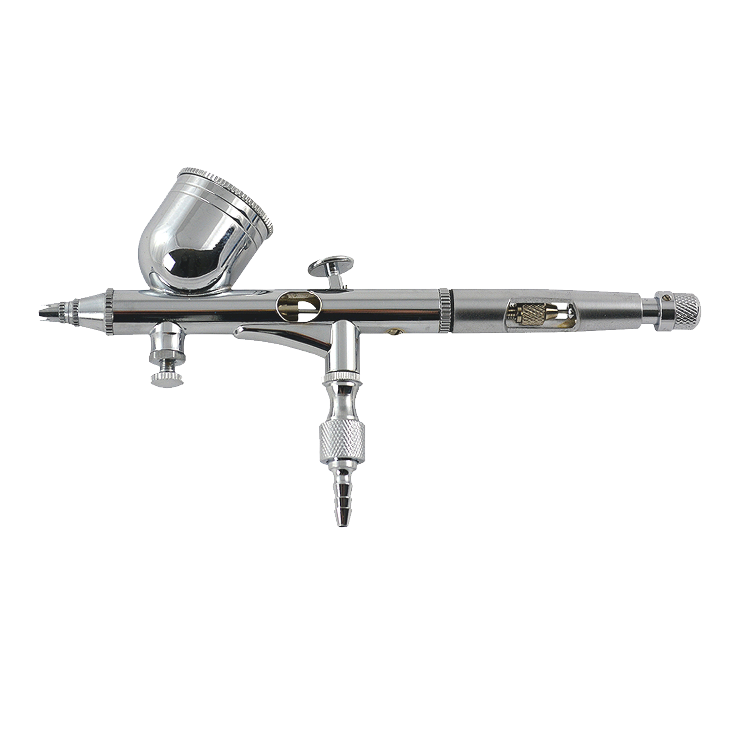 Diese Airbrush-Pistole verfügt über eine Druckregulierung und über eine Rückstellschraube zur Spray-Kontrolle.