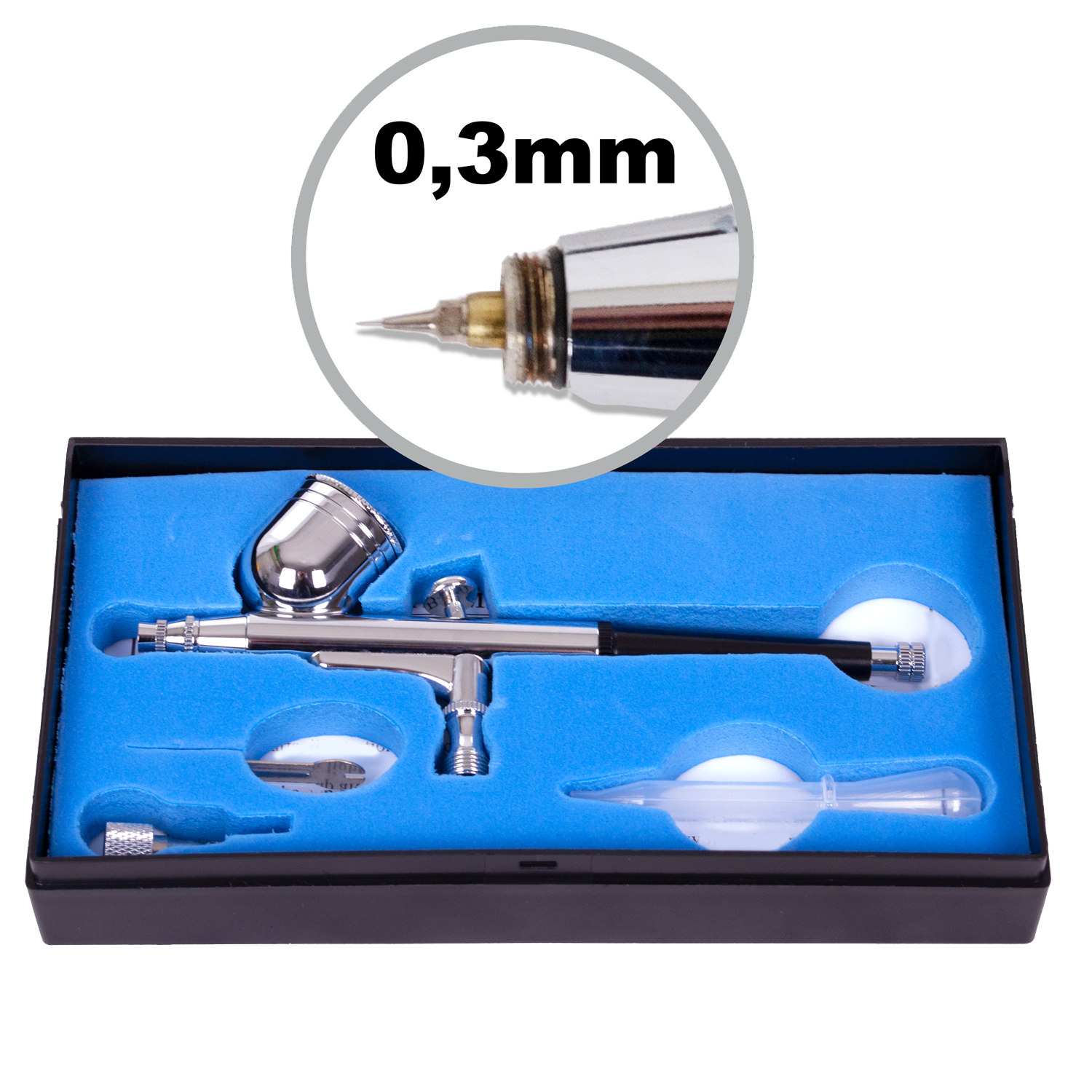 Sprühpistolen, bei denen die Farbzuführung von oben erfolgt, nennt man auch “Gravity”. Bauartbedingt haben diese Spritzpistolen meist einen festen oder gar keinen Farbbehälter oder eine (Farbmulde) von geringer Größe. Die Farbe gelangt hier direkt in den Nadelschaft und in die Düse. Die 0,3mm Düse gestattet Arbeiten bis auf Haarliniengenauigkeit aber auch groberpixelige Einsätze.