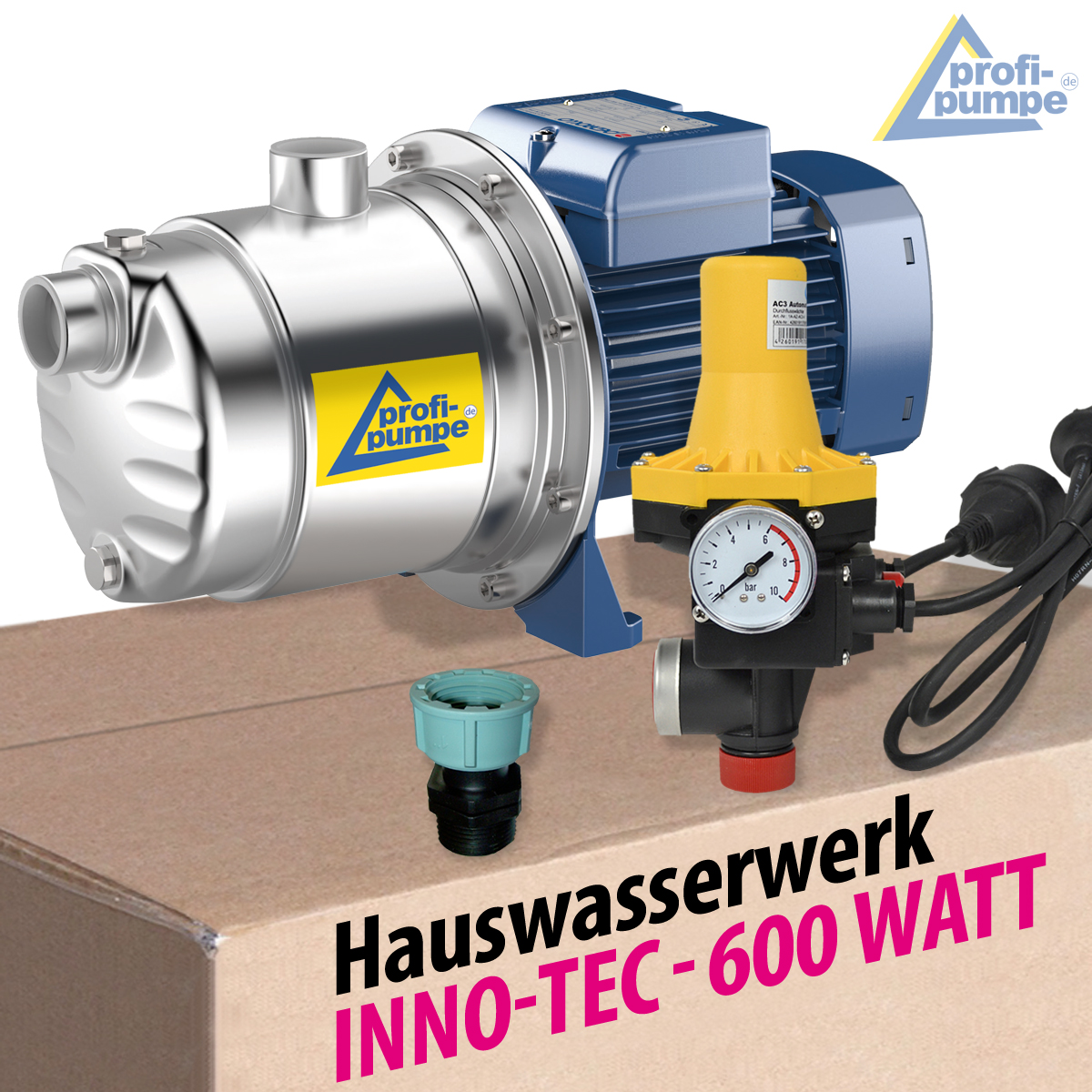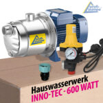 Das Hauswasserwerk INNO-TEC 600 mit der AC3-Pumpensteuerung OHNE Manometer-Controller (verkabelt) besteht aus einer hochwertigen, vierstufigen Kreiselpumpe mit 550 Watt und einem verkabelten Durchflusswächter.