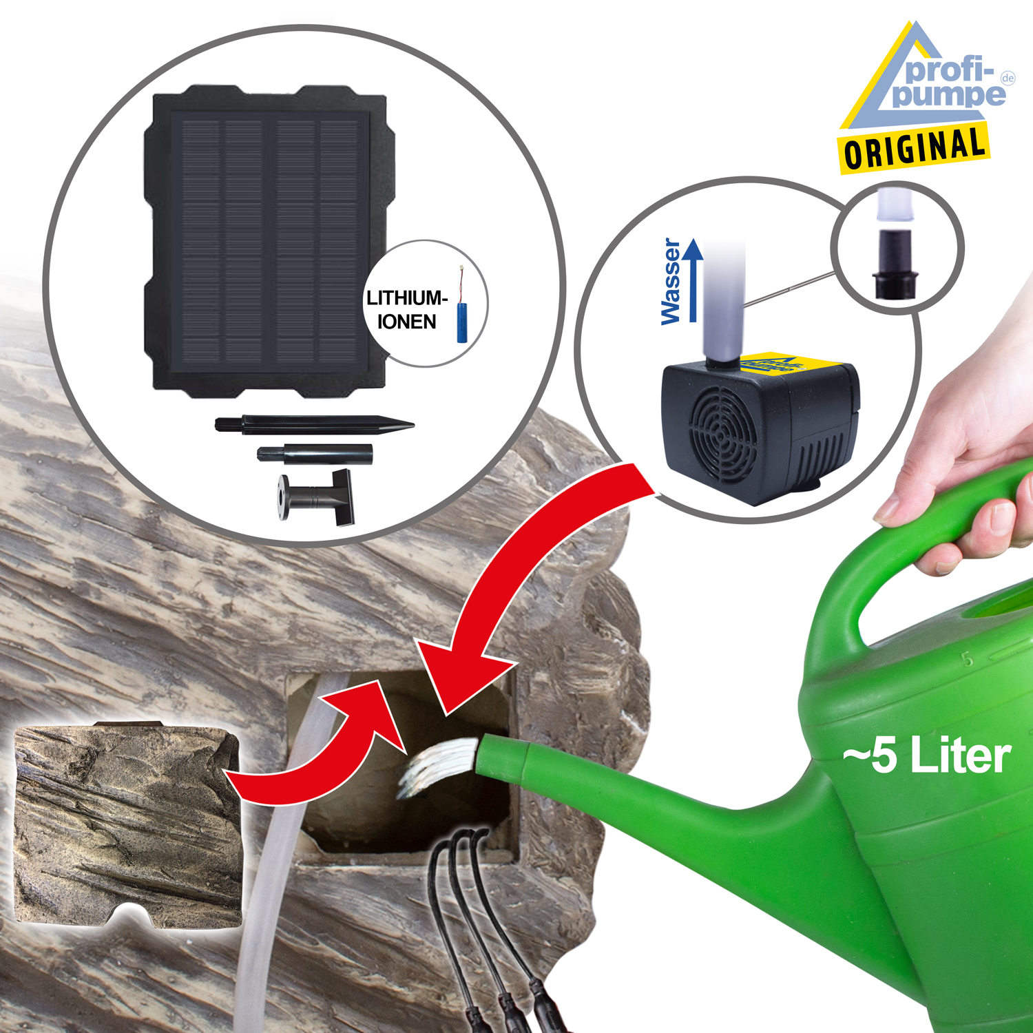 Platzieren Sie diesen Solarbrunnen einfach an einer beliebigen Stelle in Ihrem Garten. Durch das einfache Steckprinzip und dem Solarpanel ist er schnell aufgebaut. Ein weiterer Vorteil ist, dass Sie an keine Steckdose gebunden sind und das lästige Verlegen des 230V-Kabels entfällt. Kein Ärger mehr mit den durch Nagetiere beschädigten Kabeln und dadurch verursachten Stromausfällen. Außerdem können Sie das Solarsystem nach Ihrem Geschmack effektvoll positionieren. Der Gebrauch des Solarpanels ist auch die sichere Alternative zu der 230V Steckdose. Bitte bedenken Sie, dass das Solarpanel stets im vollen Sonnenlicht zu platzieren und auszurichten ist, da sonst keine Pumpenfunktion garantiert werden kann.