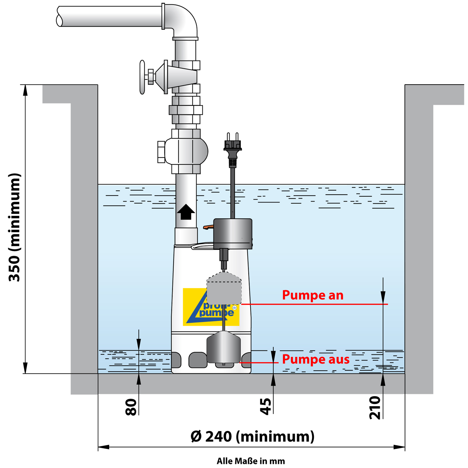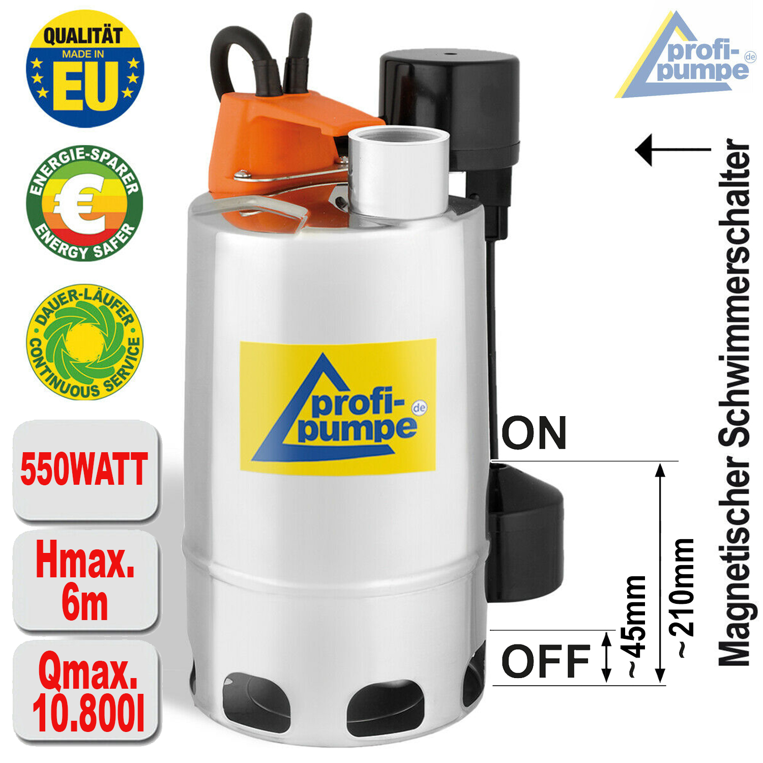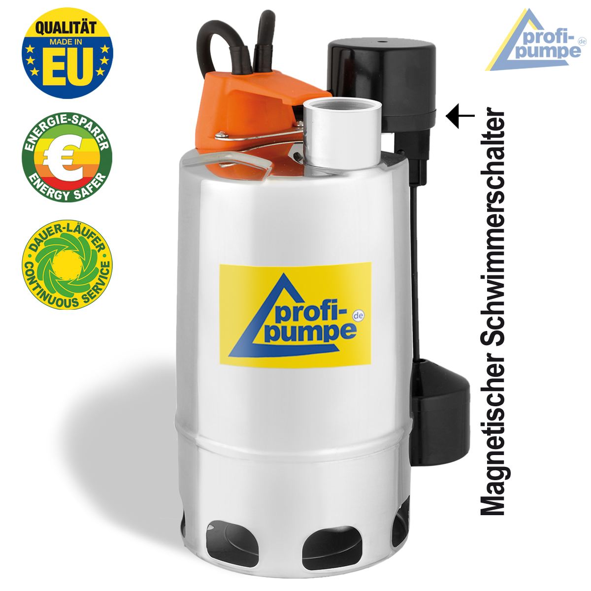 - Klarwasser- und Schmutzwasser-Tauchpumpe (Partikelgröße bis ca. 20 mm) mit Magnet-Schwimmer